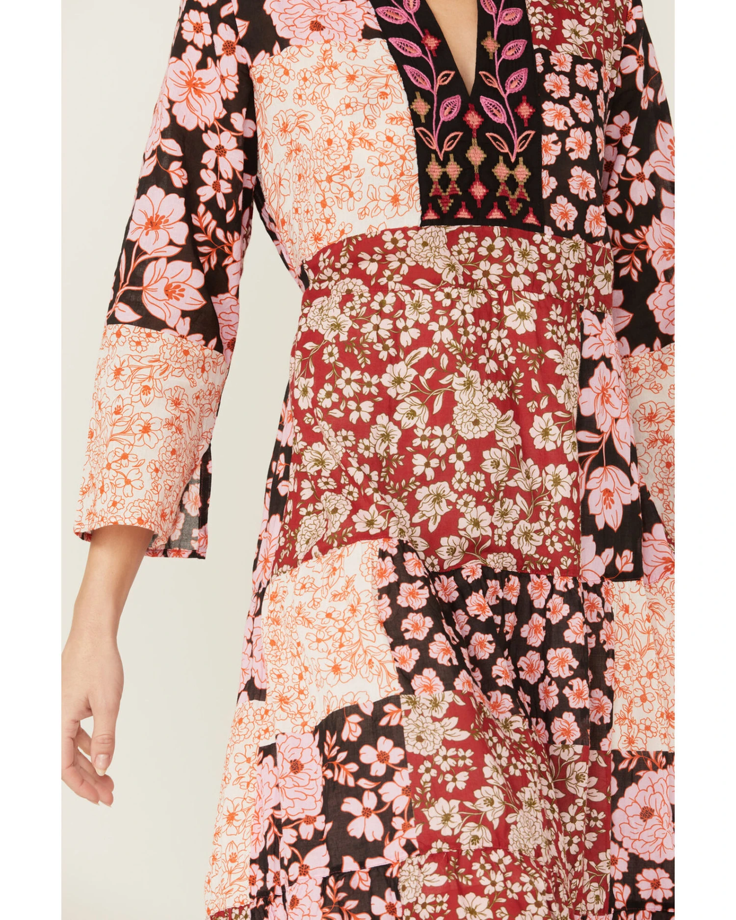 - Multicolored floral patchwork print throughout