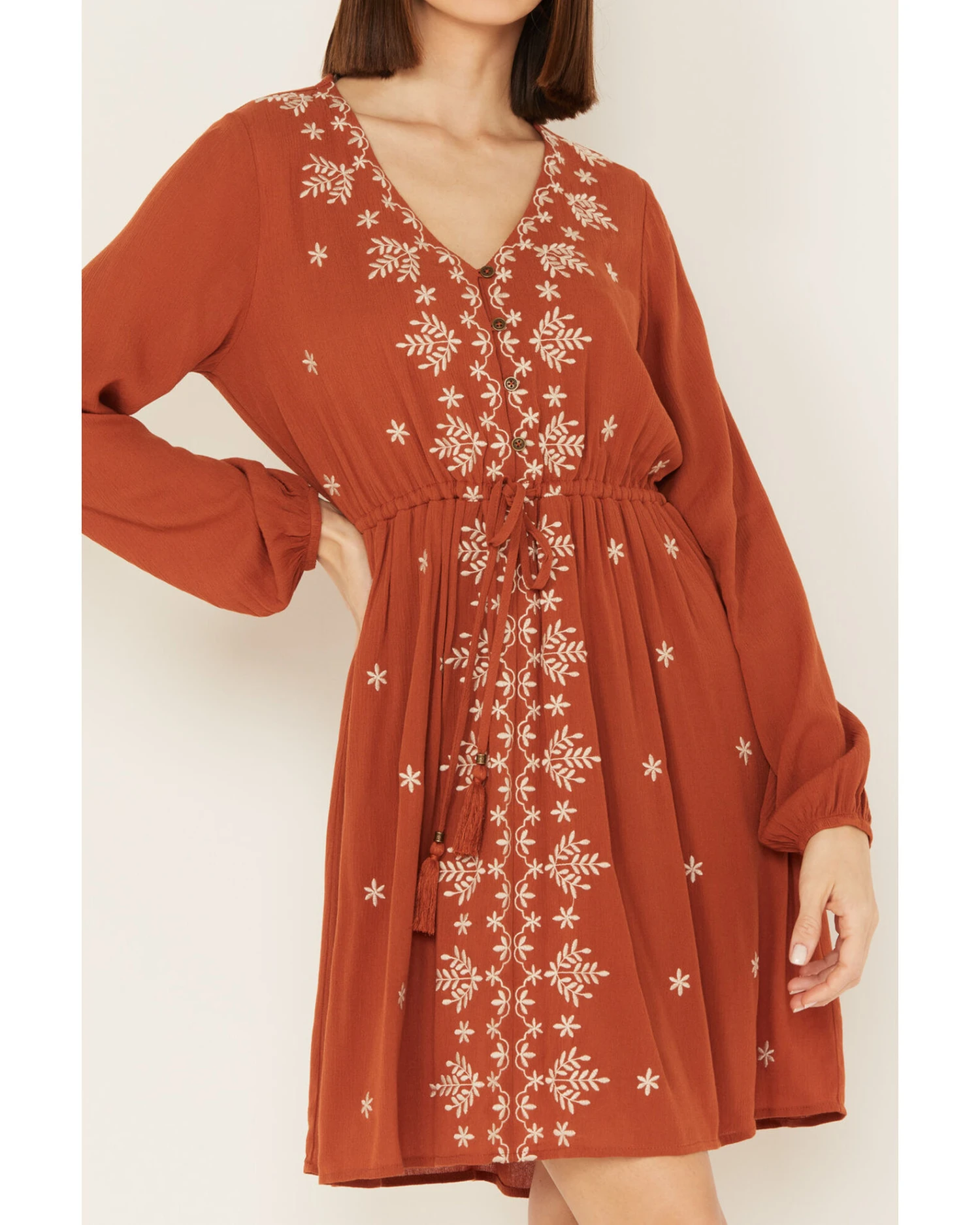 - Solid rust copper design with cream floral embroidery on front